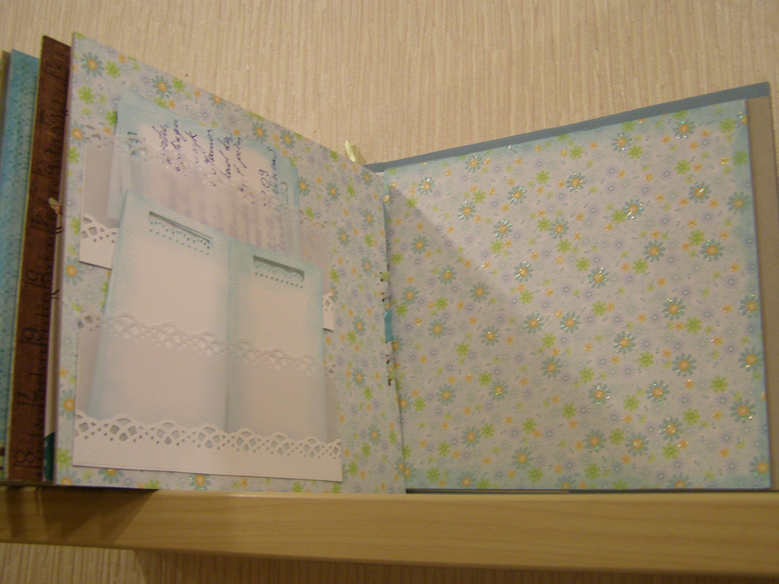 O štai čia mano gamybos dėžė albumui . Į ją dėželės kišenėlėje įdėjau baltos spalvos nuotraukų kampučius.